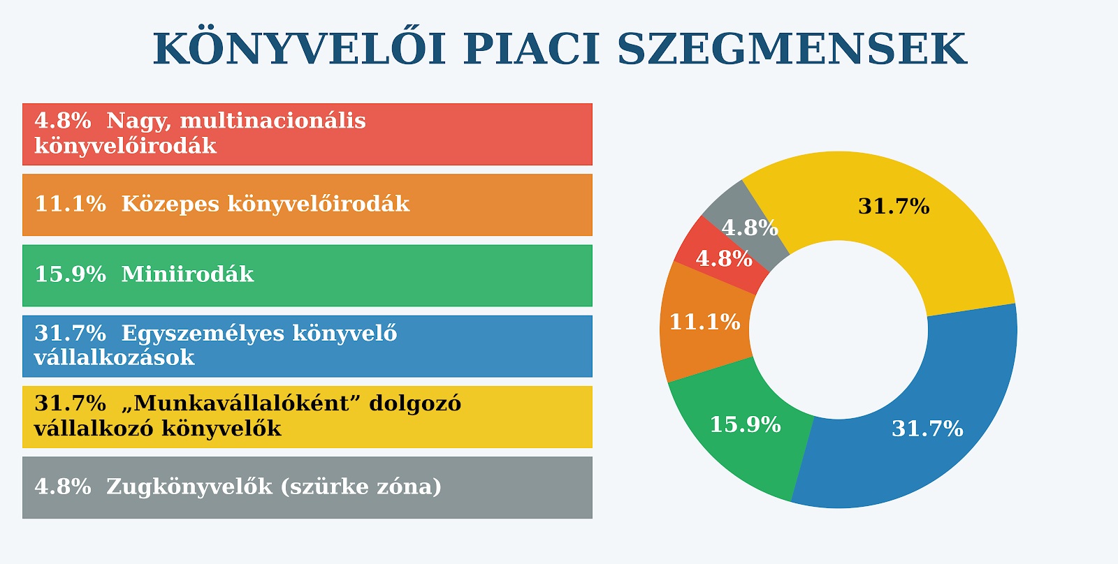 | 4 | Egyszemélyes könyvelő vállalkozások | 20 000 | 31,7% | Egyéni vállalkozás, kevés ügyfél | Piaci szétaprózódás |