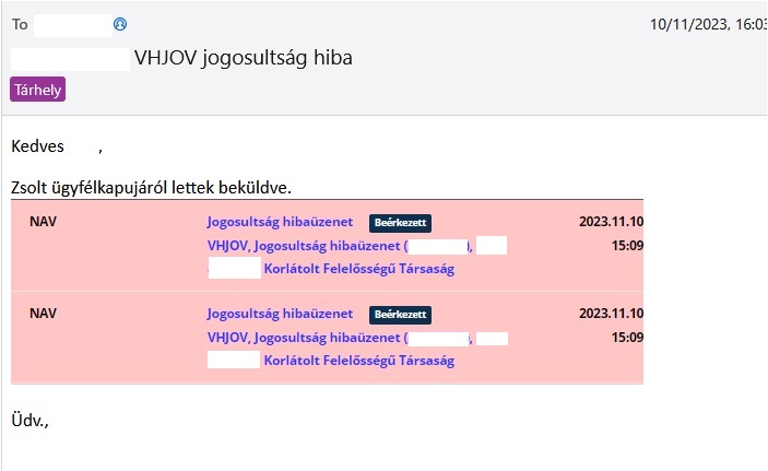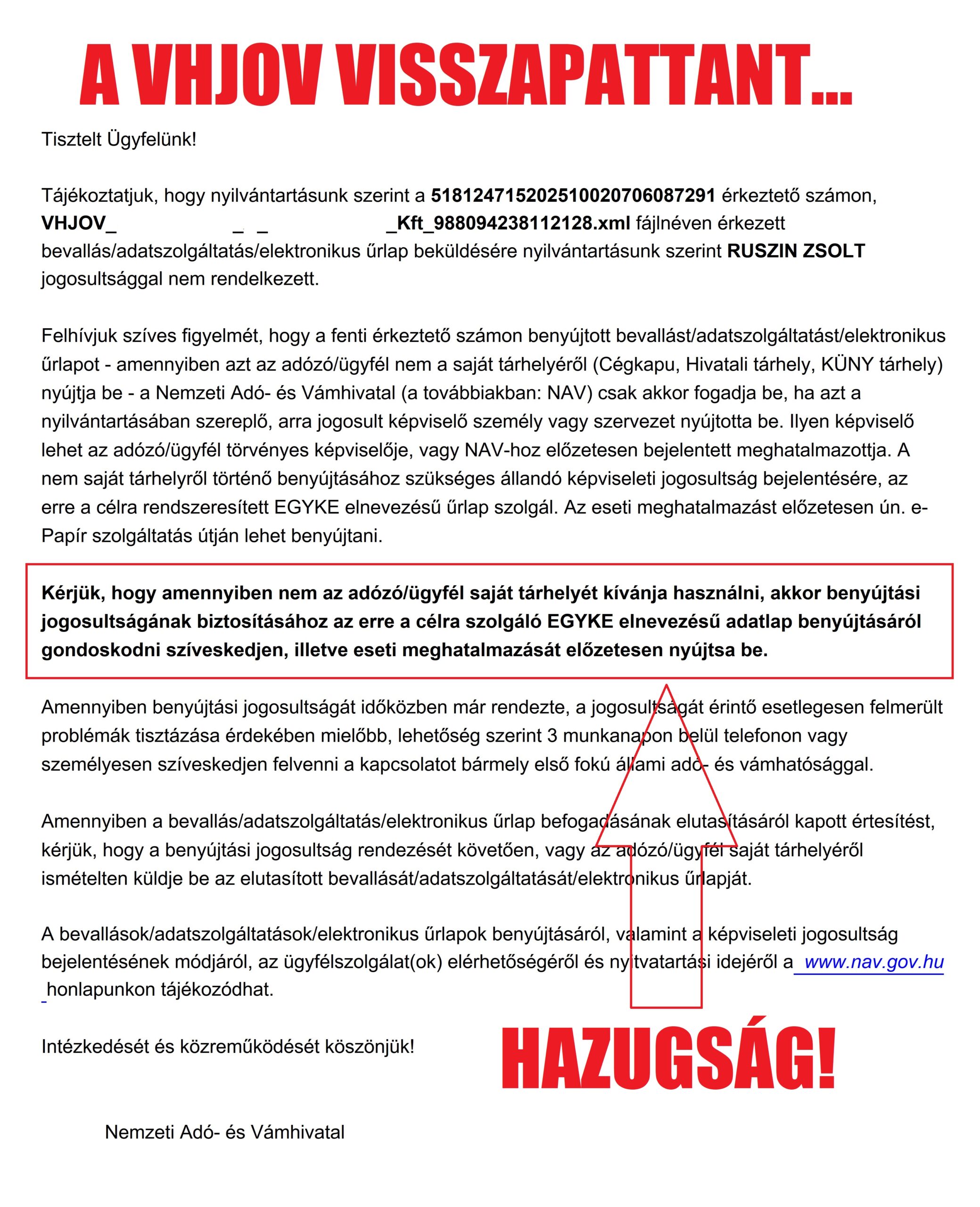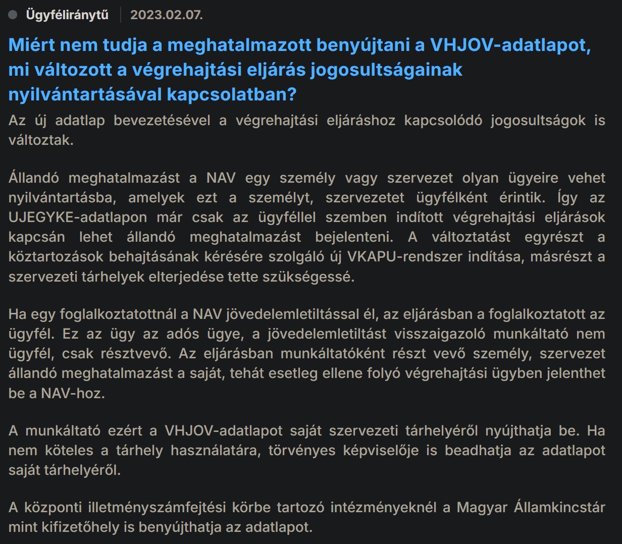 A NAV a hivatalos válaszában már 2025 júniusában elismerte, hogy a meghatalmazottakat éveken át indokolatlanul kizárta a munkáltatói végrehajtás nyomtatványainak visszaigazolásából. Ez úgy zajlott, hogy a VHJOV nevű nyomtatvány visszapattant és a válaszüzenetben a NAV azt hazudta, hogy csak be kell nyújtani az EGYKE nyomtatványt (ami azóta már UJEGYKE). A mosdató főosztály (értsd: törvényességi és felügyeleti főosztály) által jegyzett közokiratban elismerték, hogy a VHJOV kizárólag a munkáltató (kifizető) által volt benyújtható, amire nem adtak magyarázatot, viszont megígérték, hogy a meghatalmazások terén a „fejlesztés” folyamatban van. Korábban számos tájékoztatásban azt állították, hogy a munkáltatót érintő végrehajtási ügyben való eljárás során a hivatalnak történő visszaigazoláskor egyszerűen „nincs” képviseleti jog, amivel tudatosan és szándékosan szembementek az adózási rendtartással (Air. 15-17.§) és a közigazgatási rendtartással (Ákr. 13-14.§). Ezek a tájékoztatások jelenleg is – szégyenszemre – szerepelnek a hivatal honlapján.