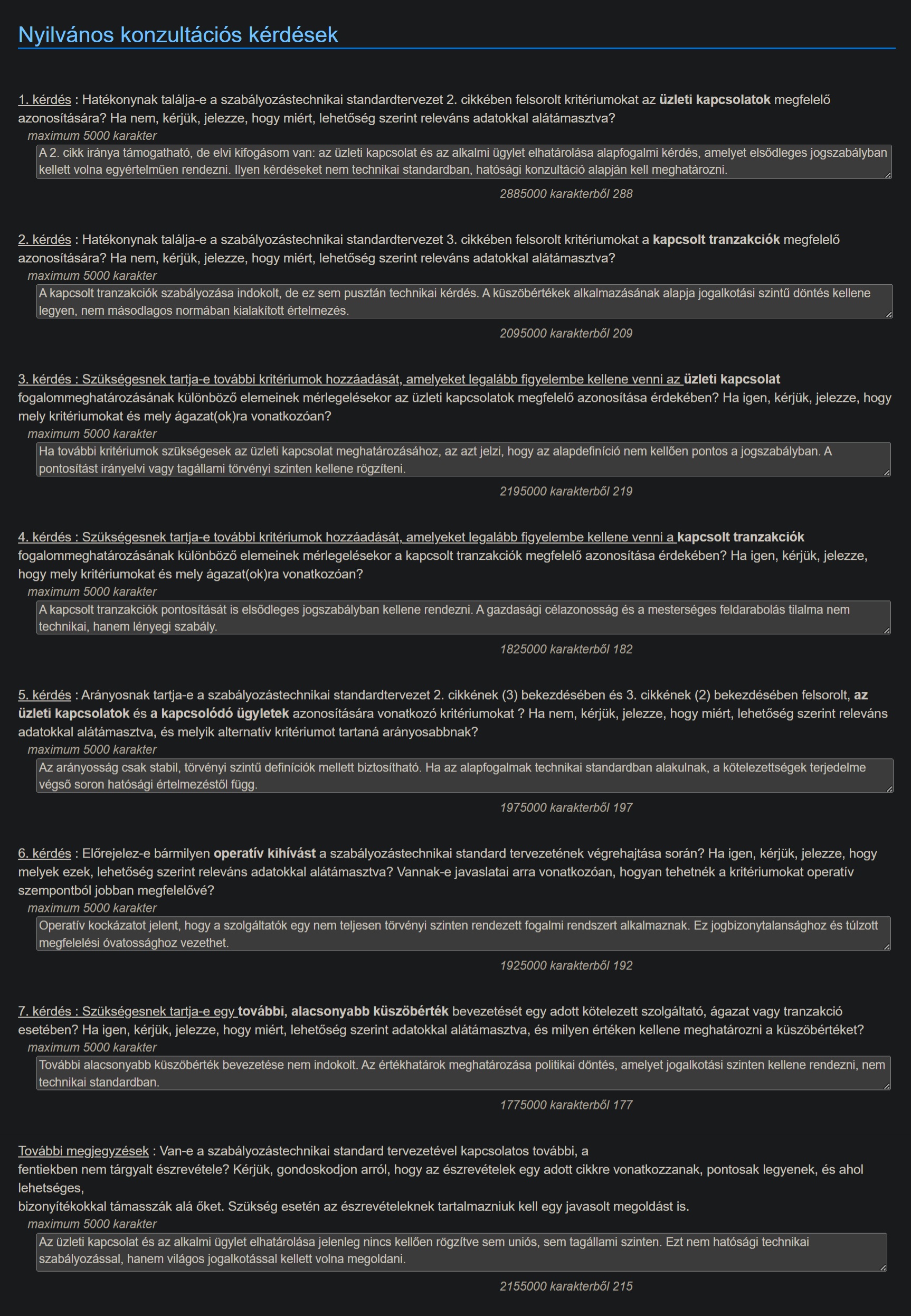 Az AMLA szabályozástechnikai standardokról szól kérdőívére adott válaszaimban (amik angolul lettek beküldve) kemény kritikával illettem a banki KYC prodcedúrák mélységét és kötelező adattartalmát, amelyeket nem lehetne azonossá tenni a nem pénzügyi szektoréval. Azt is kifogásoltam, hogy nincsenek egyszerűsített átvilágítási intézkedések az alacsony kockázatú szolgáltatások esetén, csupán értelmetlen és megterhelő adatgyűjtés, aminek hiányát bírságolhatnák.