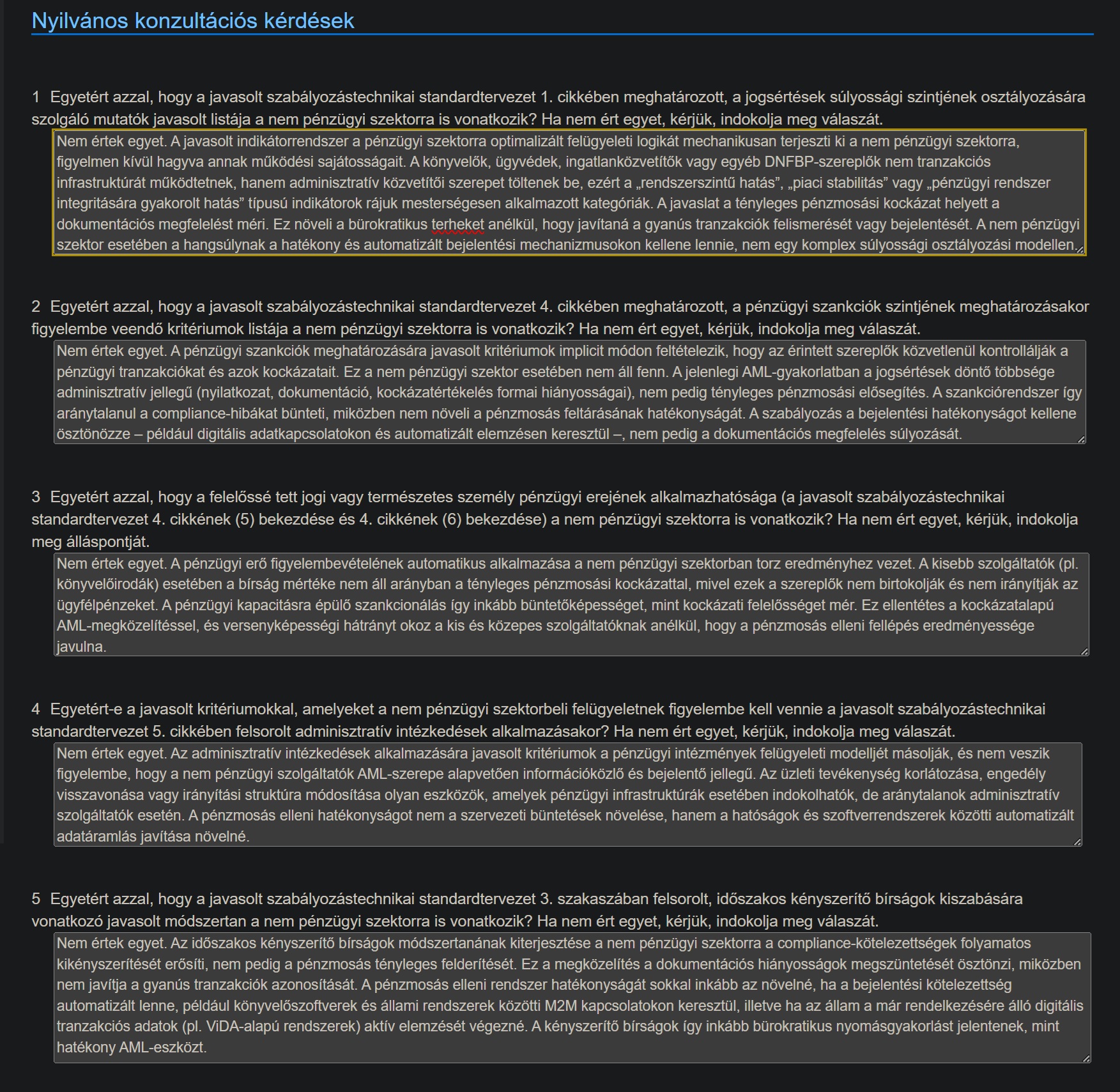 Az AMLA bírságolástechnikai kérdőívére adott válaszaimban (amik angolul lettek beküldve) kemény kritikával illettem a kötelező, egységes súlyossági besorolást, a hatósági dokumentált bírság-kalkulációt (algoritmizált képlet alapján), az adminisztrációra a vezető személyes felelősségét, az automatikusan magas kategórizálás tágítását és a nem pénzügyi szektor enyhébb kezelésének elhagyását (vagyis a brutális bírságolást).