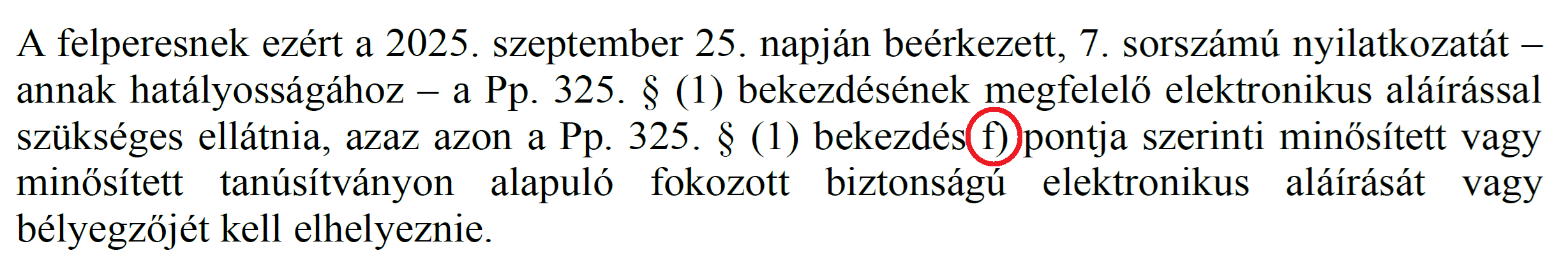 Emellett tény, hogy a DÁP eAláírás nemcsak „alkalmas” a teljes bizonyító erejű magánokirat létrehozására, de létre is hozza a teljes bizonyító erejű magánokiratot (Pp. 325.§ (1) j)). Ehhez képest a bírói végzés az f) pontra hivatkozik. Mi történhetett? Talán összekavarodtak a bíró előtt a karakterek?