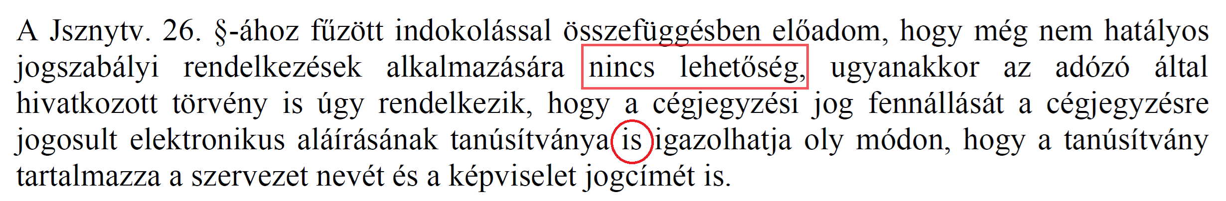 Visszatérve az új Jsznyt.-re: itt is van indoklás, amiből tudhatjuk, hogy a jogalkotó mit gondol az elektronikus aláírásról, mint cégszerű aláírásról, a korábbi Jsznyt. verzióhoz képest, az új Jsznyt-ben változatlanul megmaradt és így szól (a piros betűs rész is az indoklás része):