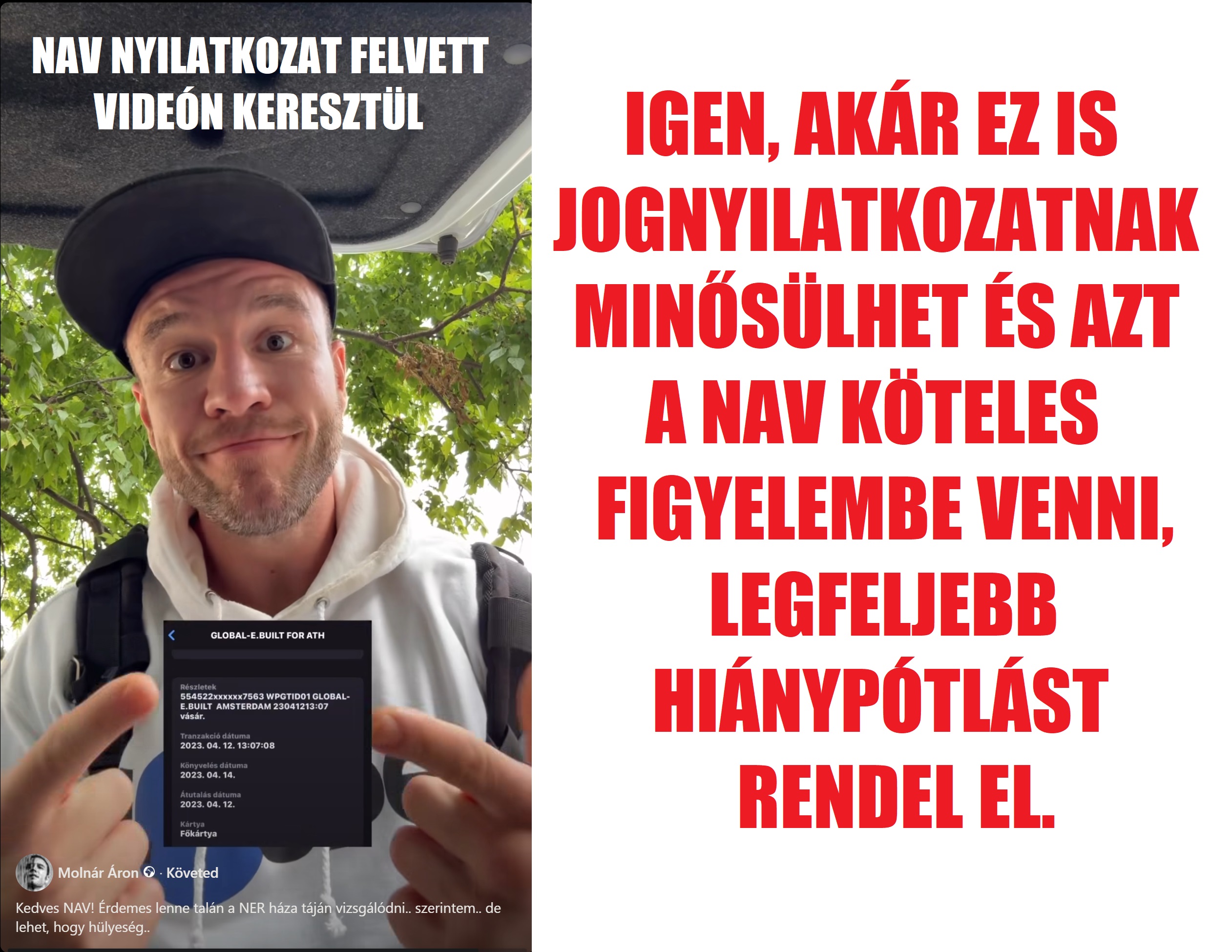 Ez az egész okoskodás a Kúria részéről nem teljesen haszontalan, mert így legalább lehet valamire hivatkozni, ami szerint az összes közlés írásbelinek minősül, de ettől még nem jogforrás. Így jognyilatkozatnak számít még Molnár Áron nyilvánosan közzétett videója is, amit meg is küldtem a NAV számára, akik kínjukban csak általánoskodást voltak képesek visszaírni. Ezekből kirajzolódik a jogalkotói mulasztás, ami legyint a fejlődésre és a jognyilatkozat és az azon belül az aláírás mibenlétét szabályozatlanul hagyja. Úgyhogy hajrá, nyújtsunk be mindent is, ami jognyilatkozatnak minősül, igaz?