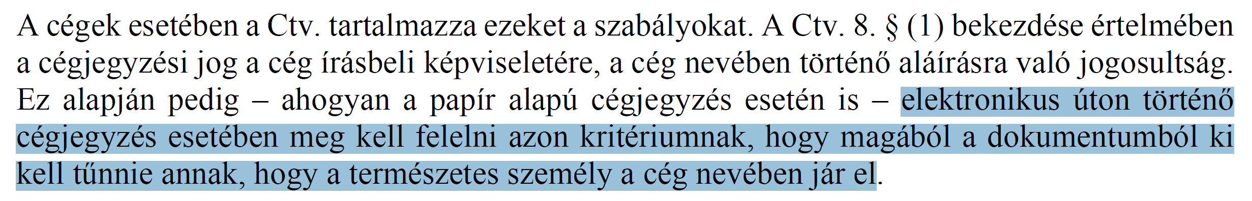 A fentiek alapján elektronikus úton tett írásbeli képviseletnek minősül bármilyen megoldás, amelynél teljesül az a feltétel, hogy a képviselőtől származó, hozzá köthető elektronikus aláírás jön létre, és az aláírt dokumentumból kiderül, hogy az aláíró azt a jogi személy nevében írta alá.