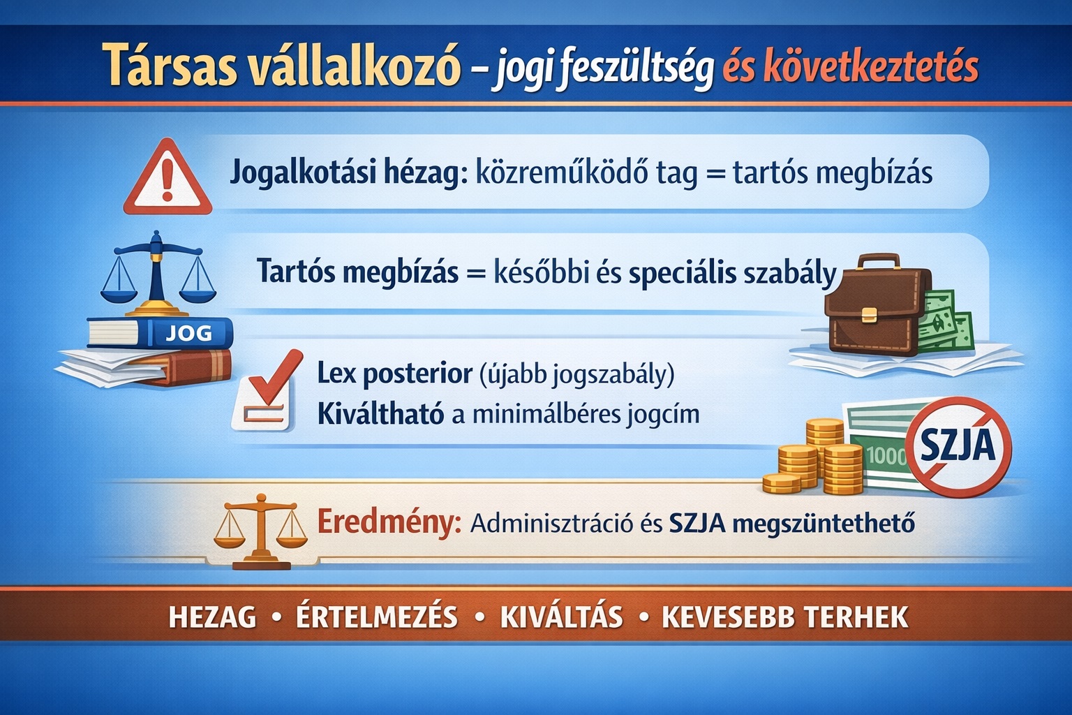 Miután a tartós megbízási jogviszony a frissebb, speciális szabály (Lex posterior derogat legi priori), ezért ha a közreműködő tag úgy dönt, hogy most már nem kíván a teljes minimálbér után fizetni, hanem a közreműködéséhez „elég” a tartós megbízás, akkor az alapján a munkavégzése (közreműködése) megalapozott, azt a NAV nem kifogásolhatja. Ez ilyen tagok persze eddig is alkalmazhatták a csökkentett munkaidejű munkaviszonyt, vagy a minimálbér 30%-át elérő megbízást, csakhogy ehhez SZJA is párosult. Most kikapcsolhatják a személyi jövedelemadót, így az eddigi személyi jövedelemadót és a kifizetéshez kapcsolódó, illetve a munkajogi adminisztrációt kikapcsolhatják.