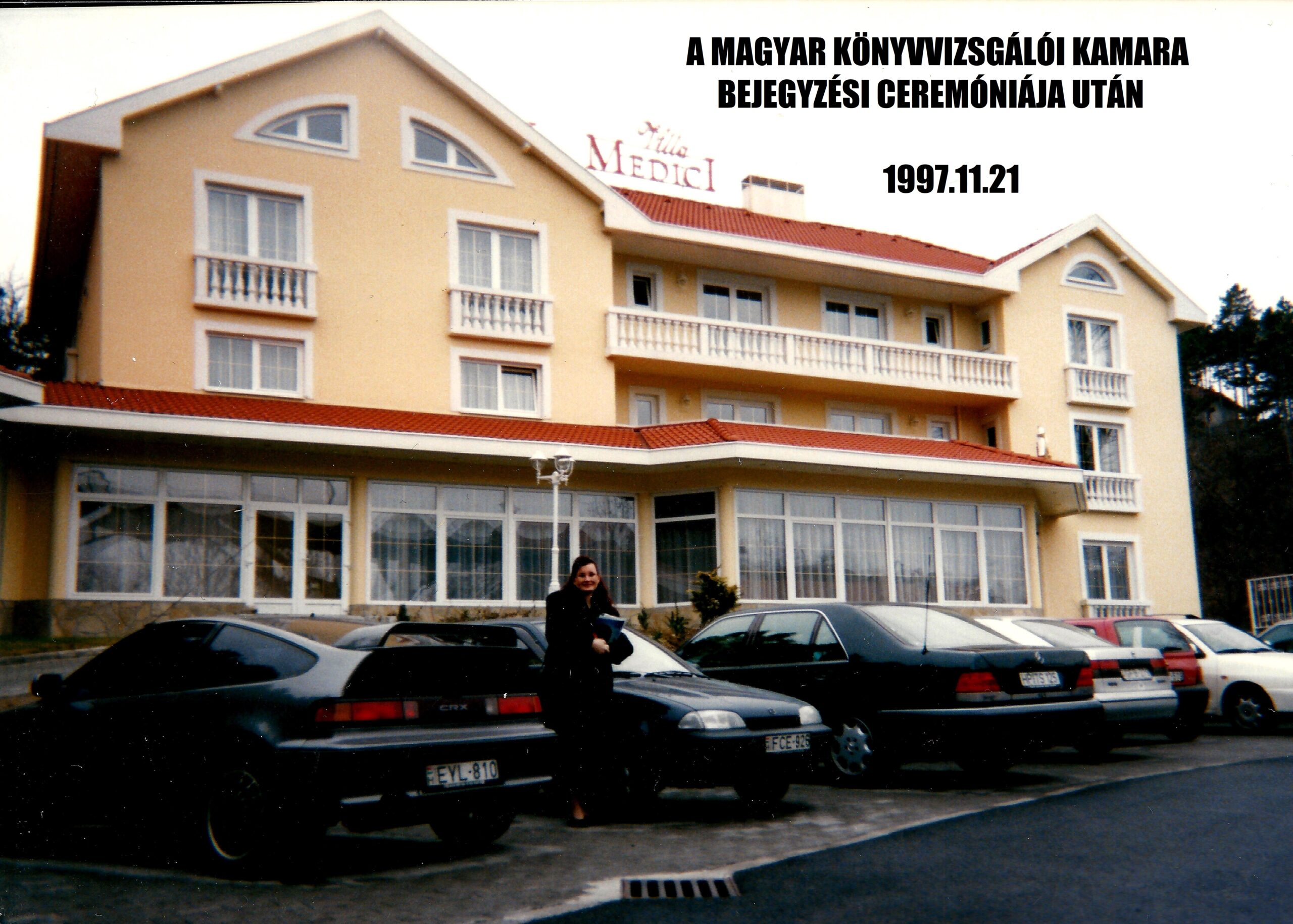 Botrányos vizsgáztatás után lettem 1997-ben lettem az ország egyik legfiatalabb okleveles könyvvizsgálója. Ennek a sztorija se semmi. Egy pici szobában vizsgáztattak bennünket a Perfektnél, ahol hallhattuk a másik feleleteit. Én is hallottam, ahogy a feleségemtől azt kérdezték, hogy a könyvvizsgálónak kell-e vizsgálni az adókötelezettségeket. A kérdező szerint a helyes válasz a „Nem!” volt, amin felháborodtam, hiszen a rövid lejáratú kötelezettségek és a saját tőke vizsgálatába masszívan beleszámítanak az adókötelezettségek. Miután a feleségem igyekezett logikusan és világosan válaszolni és az adók vizsgálatának szükségességét hangsúlyozta, a vizsgáztató megbuktatta őt. Ekkor közöltem, hogy ilyen botrányos vizsgáztatáson nem kívánok részt venni tovább, így közösen buktunk meg. A vizsgát – a panaszom nyomán – megismételték és természetesen azt mindketten teljesítettük. A kép a Könyvvizsgálói Kamara rendezvényén készült Veszprémben, a Villa Medici épületénél, a „mi autónkkal”.