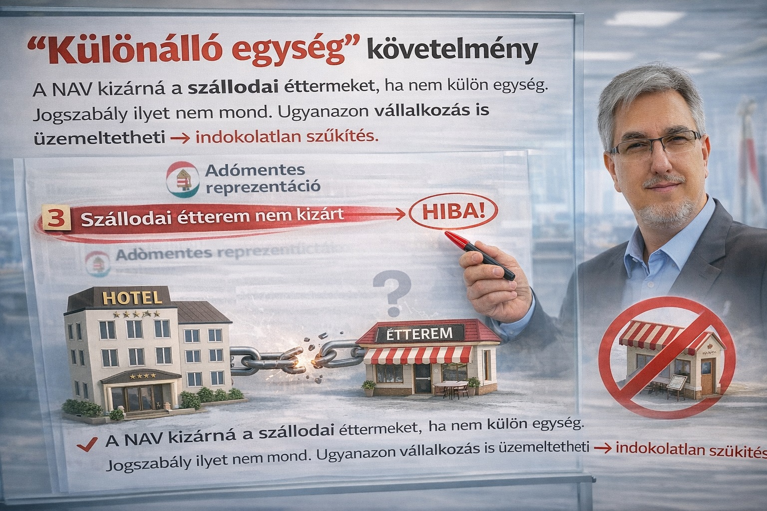 A harmadik se kisebb tájékoztatási hiba. A NAV tájékoztatásában ez a mondat szerepel: A reprezentáció kedvező szabályai kizárólag a különálló egység által üzemeltetett étteremben nyújtott éttermi vendéglátásnál alkalmazhatók, a szálloda szerves részeként működő étterem vendéglátással kapcsolatos szolgáltatásai esetén nem. Ez egyáltalán nem így van! Számos olyan szálláshely található az OKNYIR nyilvántartásában, amely ugyanazzal a vállalkozással éttermet is üzemeltet, annak nem kell semmilyen „különálló egység”!