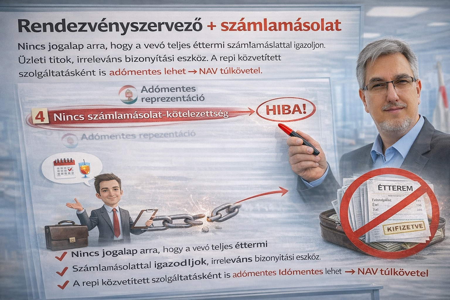 A NAV tájékoztatója azonban tartalmaz egy hibás mondatot a témáról: A rendezvényszervezőnek a reprezentációs juttatást az éttermi, cukrászdai számla másolatával kell alátámasztania. Egyrészt ez a mondat nem tisztázza, hogy a NAV szerint miért kellene rendelkeznie egy kuncsaftnak a rendezvényszervező TELJES ügyfélkörben történt fogyasztást lefedő számlával – ami üzleti titok – másrészt az miért lenne kelléke az adómentességnek? A rendezvényszervező ugyanis bátran számlázhat repit, ez eddig is így volt.