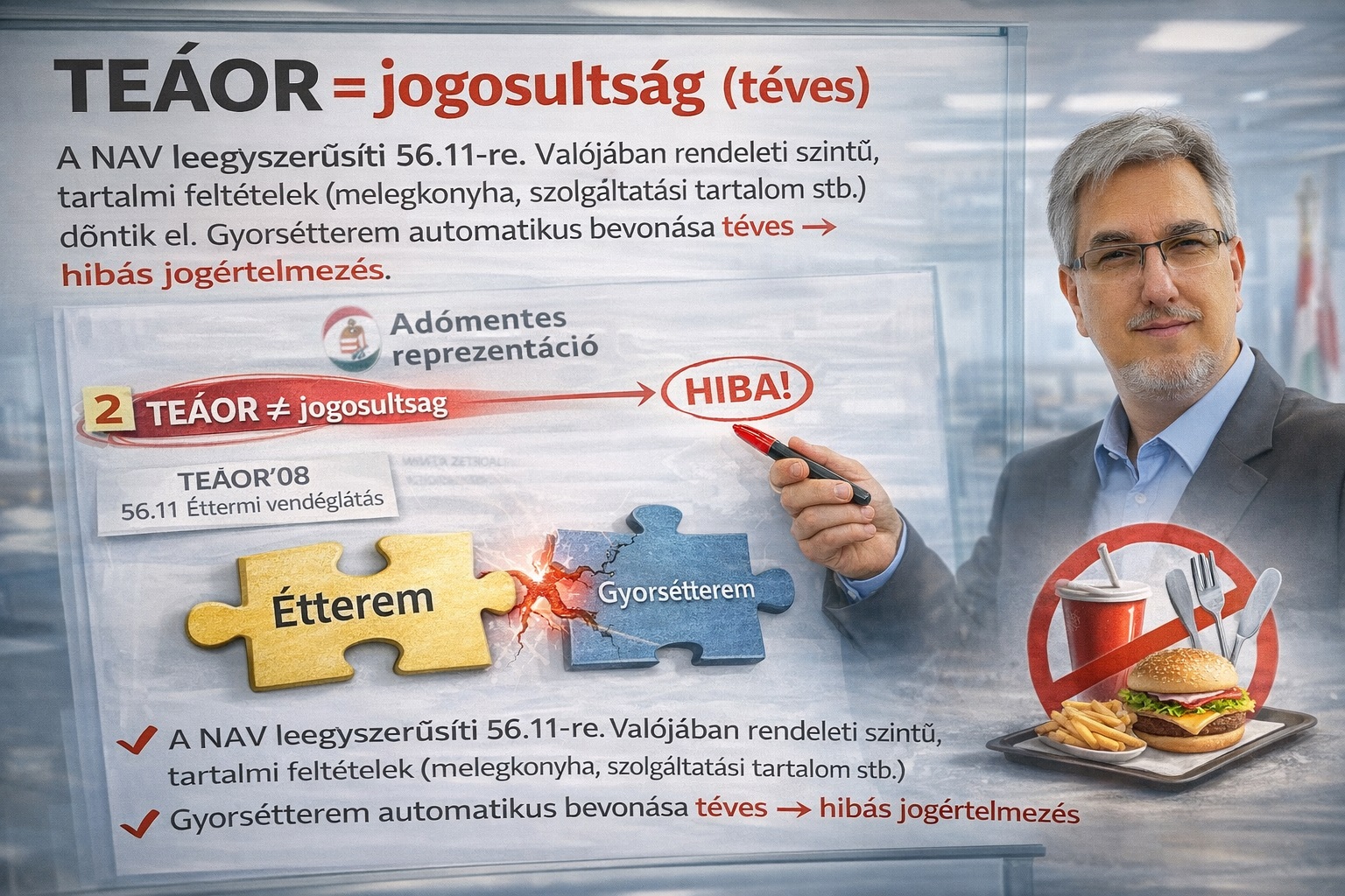 A NAV telefonos tájékoztatását adó ügyintéző hölgy szerint a gyorsétterem is ez alapján belefér az adómentességre – ez nem vicc, ez tényleg elhangzott, megvan a felvétel. Sikerült ugyanis a tájékoztatóban azt írni, hogy „Az adómentesség a TEÁOR’25 „56.11 Éttermi vendéglátás” tevékenységi kóddal nyilvántartásba vett vendéglátóhelyek esetében valósul meg.” Ez nem igaz! Az NGM egy sokkal bonyolultabb azonosítást alkalmaz a rendeletre hivatkozva melegkonyhás étteremre és cukrászdára, ami a rendelet külön és részletesen szabályoz, az evőeszközökig bezárólag. Más kérdés, hogy miután kielemeztem a témát, a NAV-os hölgy rámtette a telefont. Én értem, hogy egy NAV ügyintéző felháborodik a NAV saját tájékoztatásán…